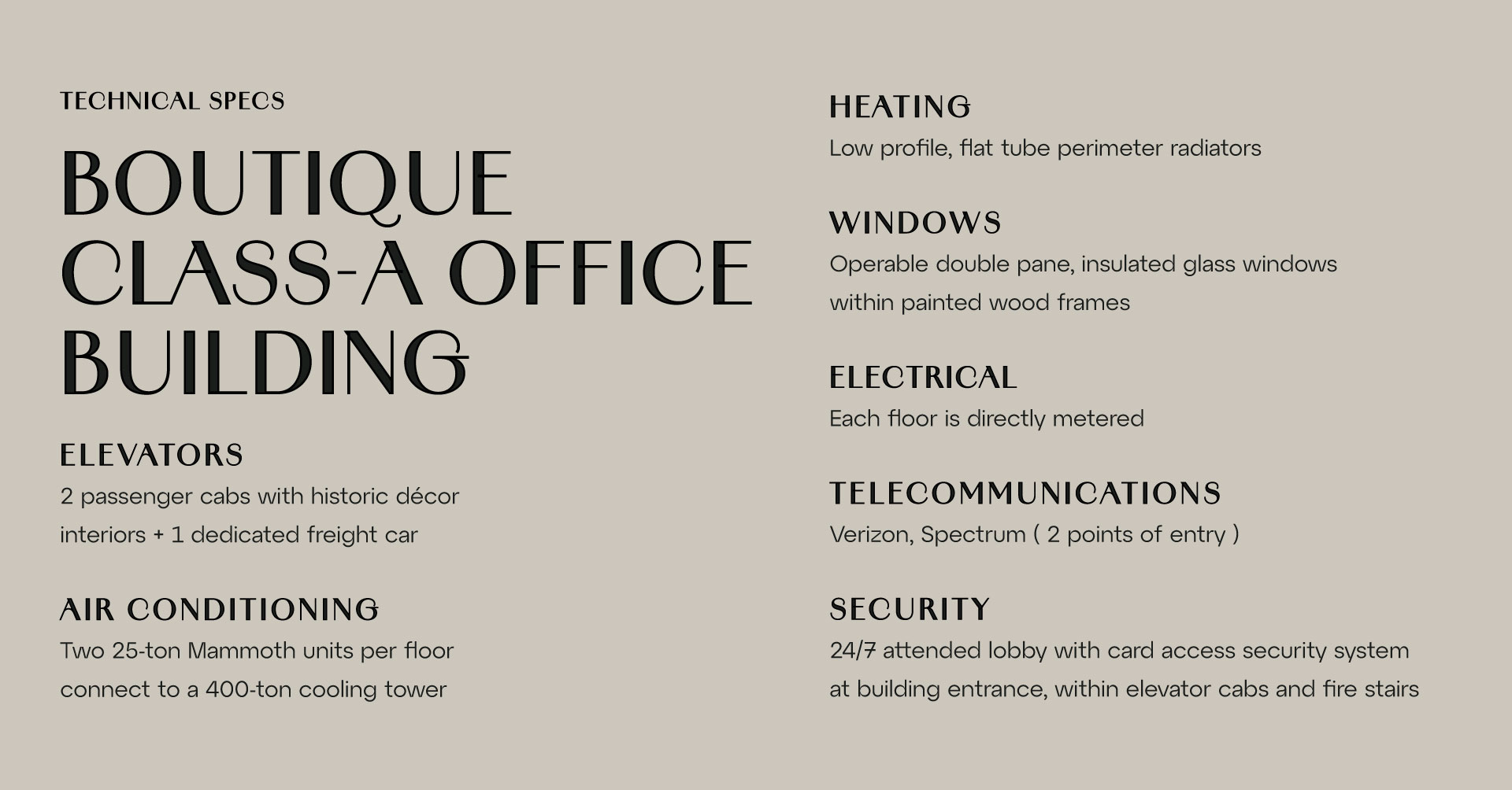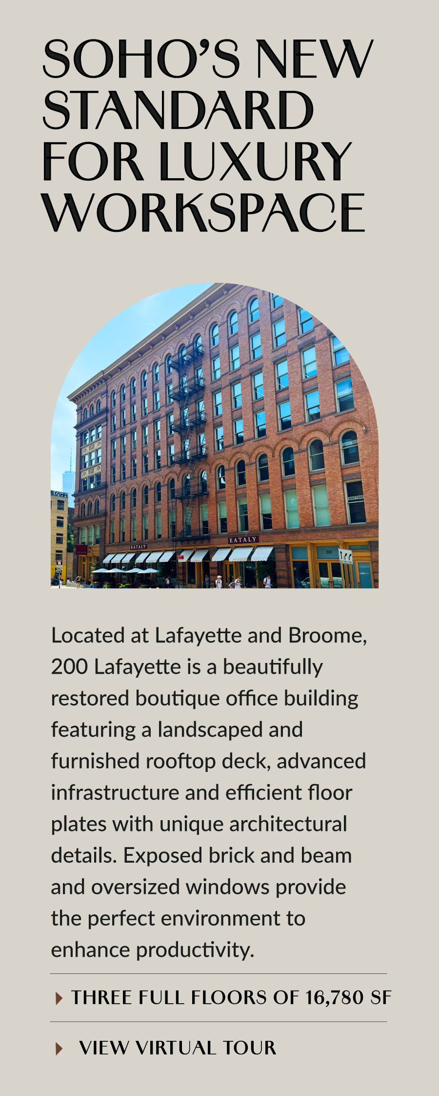 Located at Lafayette and Broome, 200 Lafayette is a beautifully restored boutique office building featuring a landscaped and furnished rooftop deck, advanced infrastructure and efficient floor plates with unique architectural details. Exposed brick and beam and oversized windows provide the perfect environment to enhance productivity.