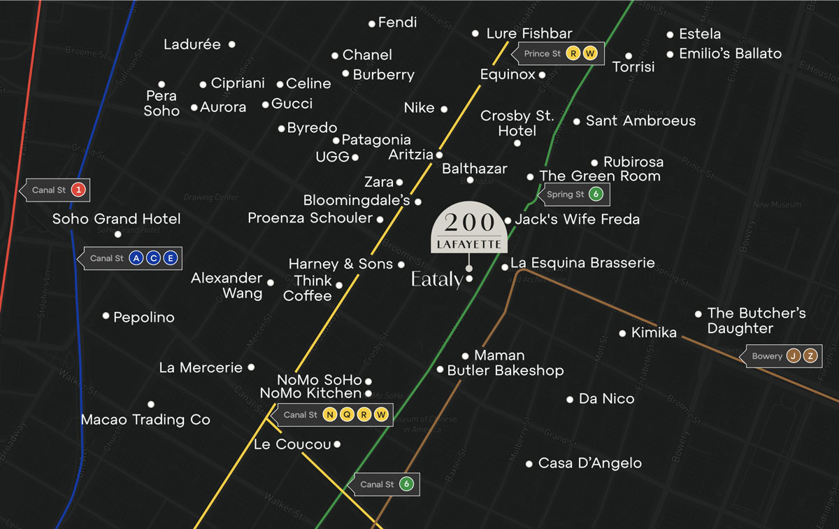 Conveniently located just 1 block from Spring Street, 200 Lafayette is easily accessible by multiple subway lines and is surrounded by a variety of restaurants, hotels and retail.