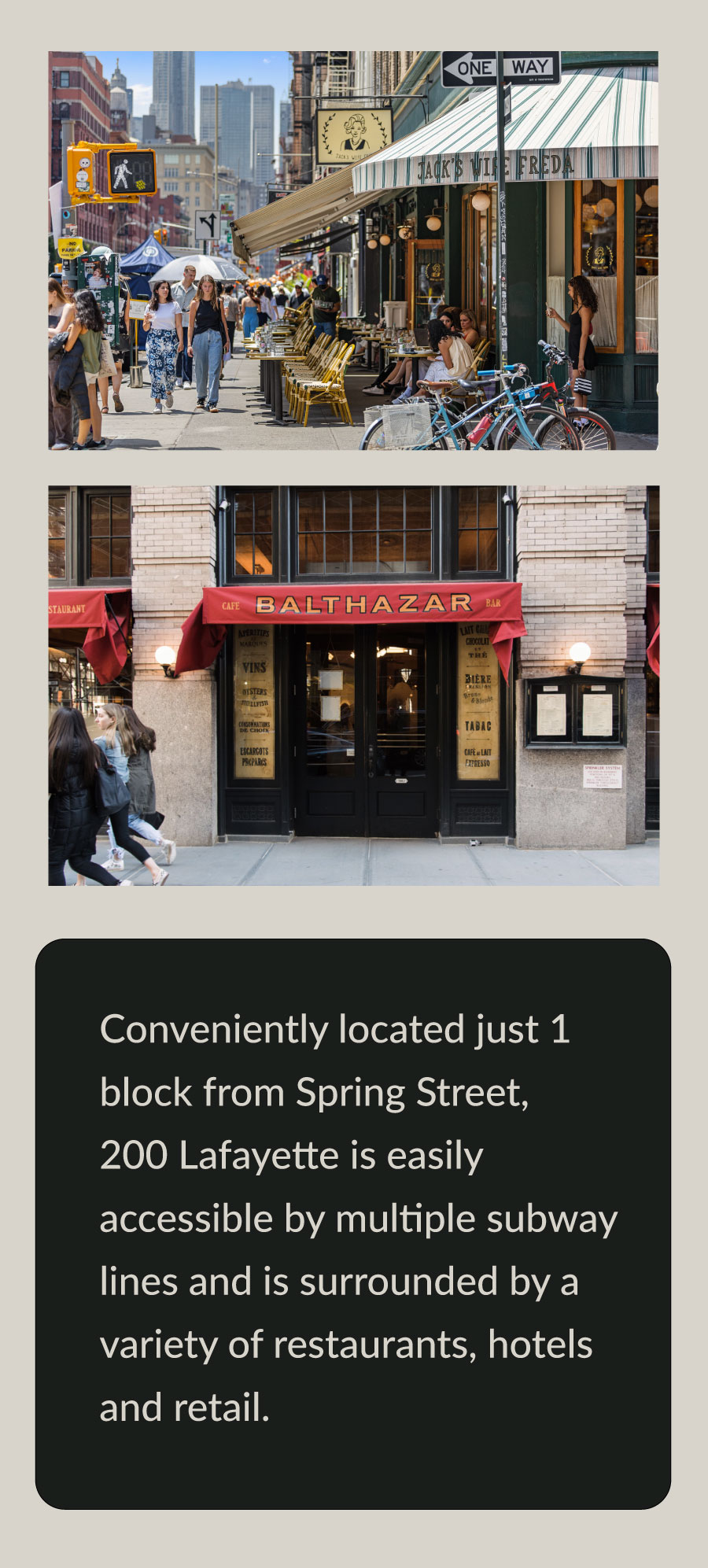 Conveniently located just 1 block from Spring Street, 200 Lafayette is easily accessible by multiple subway lines and is surrounded by a variety of restaurants, hotels and retail.